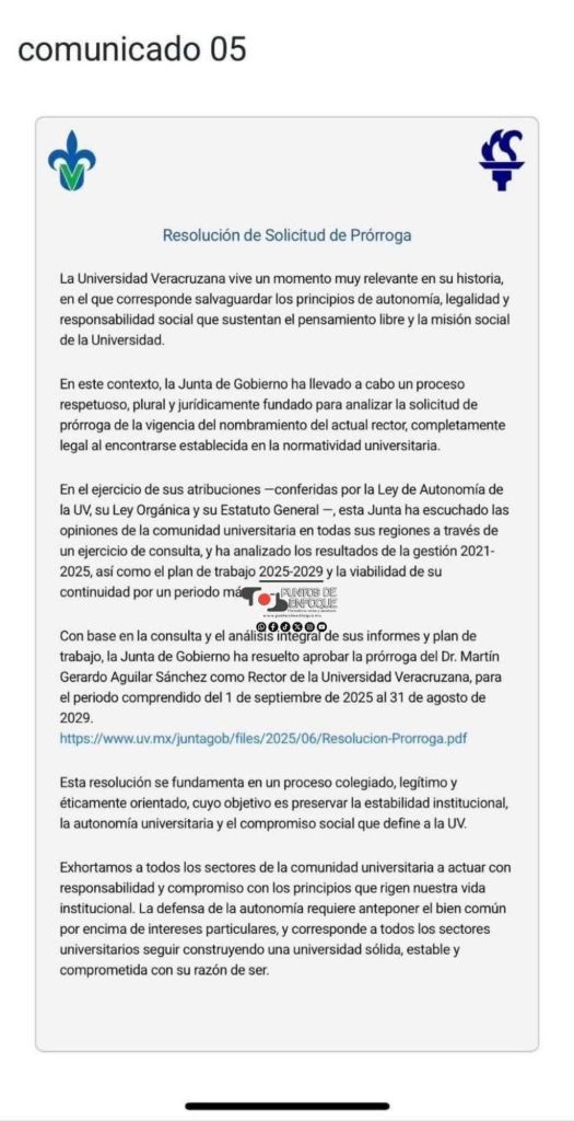 La Universidad Veracruzana (UV) atraviesa un momento clave en su historia institucional. En un ejercicio de legalidad, pluralidad y responsabilidad social, la Junta de Gobierno ha resuelto aprobar la prórroga del nombramiento del Dr. Martín Gerardo Aguilar Sánchez como Rector de la UV para el periodo del 1 de septiembre de 2025 al 31 de agosto de 2029.