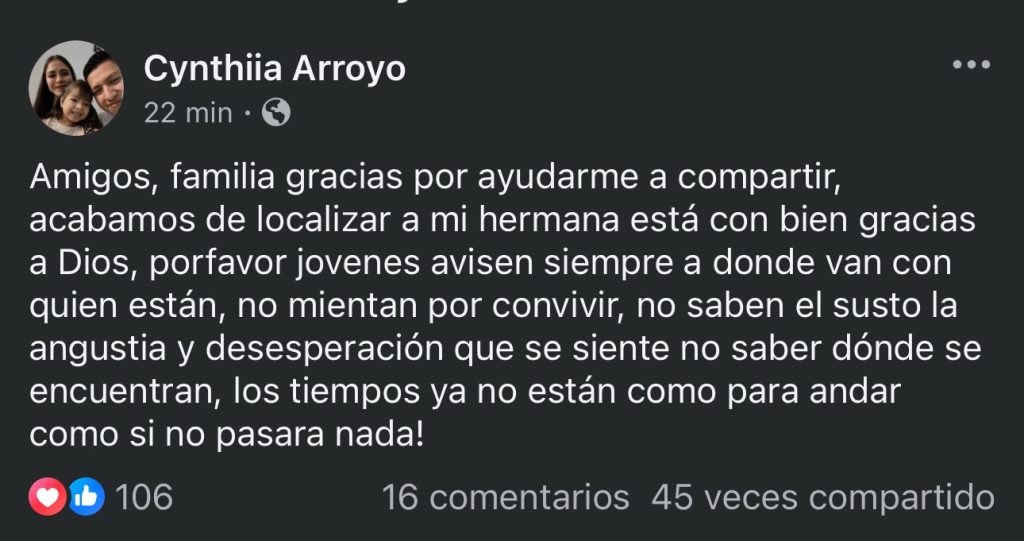 Se dio a conocer que la joven universitaria fue localizada sana y salva, asi lo dieron a conocer sus familiares. Lo anterior tras haber desaparecido después de asistir a una fiesta en la planilla de medicina de la Universidad Veracruzana (UV) en el club de Leones. Según informaron sus familiares, la última vez que se supo de ella fue en dicha fiesta.