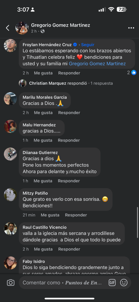 “Gracias a Dios y a todos ustedes por sus oraciones y muestras de cariño. Hoy, con el corazón lleno de gratitud, puedo decir que ya estoy en casa, rodeado de mi familia.