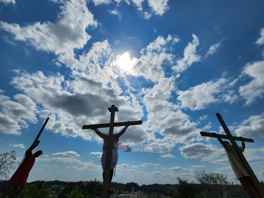 Desgarraron sus ropas, se las repartieron y más tarde, en signo de burla le colocaron una corona de espinas, que lo hizo sangrar de inmediato. Minutos después fue obligado a cargar su cruz, hasta el Gólgota o Monte de los Olivos, representado por el Cerro del Jazmín.