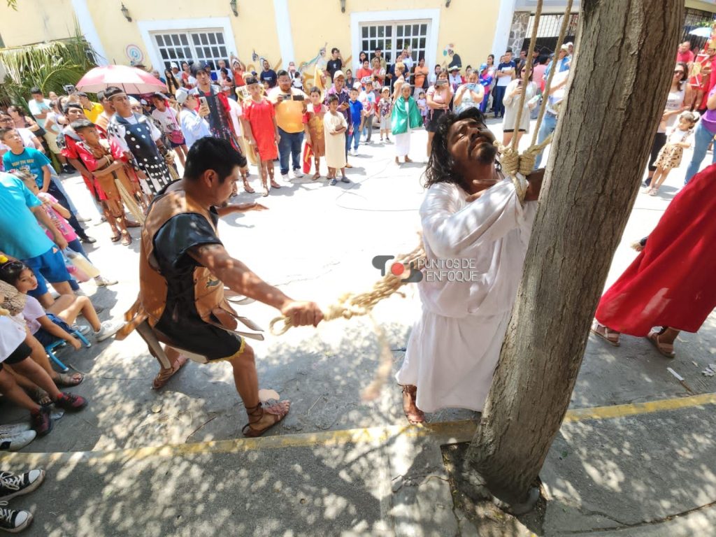 Así empezó el cuadro bíblico representado por el grupo de Judíos de Papantla, que en esta Semana Santa, cumplen 35 años de representar La Pasión de Cristo, ante el turismo que arriba a la ciudad, lo mismo que a los pobladores creyentes, bajo los rayos del sol que caían a plomo, los integrantes del grupo representaron sus papeles de forma espectacular.
