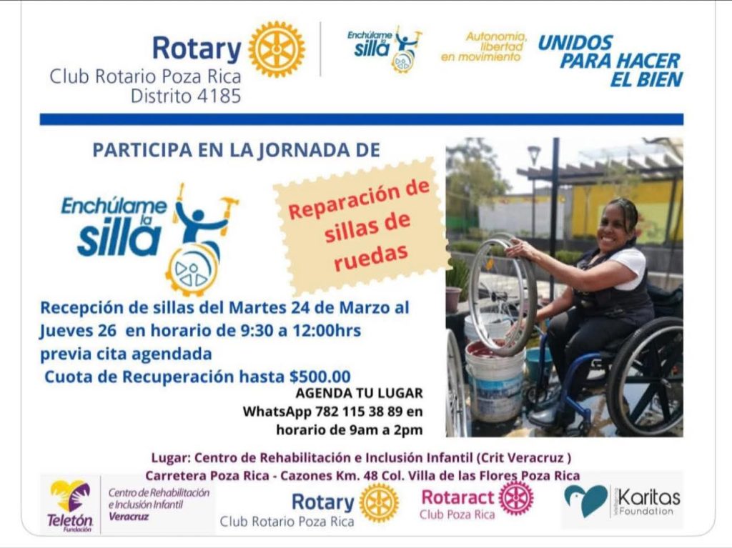 El Club Rotario Poza Rica anunció la apertura del registro para participar en la jornada de servicio “Enchúlame la Silla”, programa enfocado en la reparación y mantenimiento de sillas de ruedas.