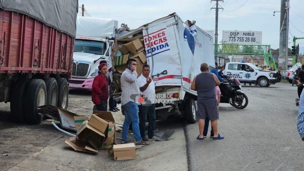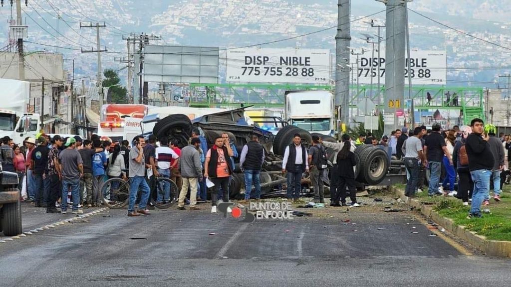 El percance se registró alrededor de las 16:00 horas, y ocurrió en el semáforo frente a la entrada a “Las Habitacionales”, en Santiago Tulantepec. La cabina del tractocamión quedó volcada sobre uno de sus costados en el camellón.