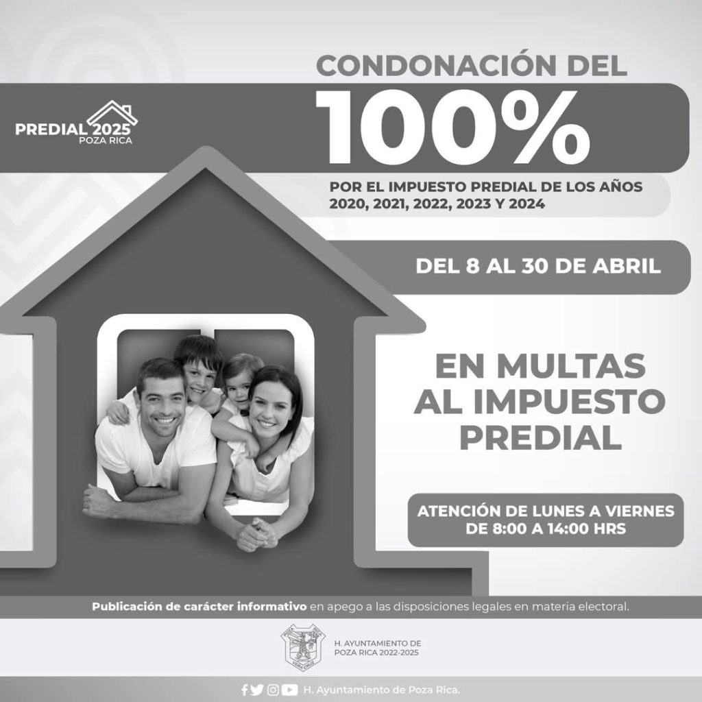 El Ayuntamiento de Poza Rica hace un llamado a la ciudadanía a que aproveche la condonación del 100% de descuento en multas generadas por concepto del Impuesto Predial correspondientes a los ejercicios fiscales 2020, 2021, 2022, 2023 y 2024, con vigencia hasta el día 30 de abril de este año.