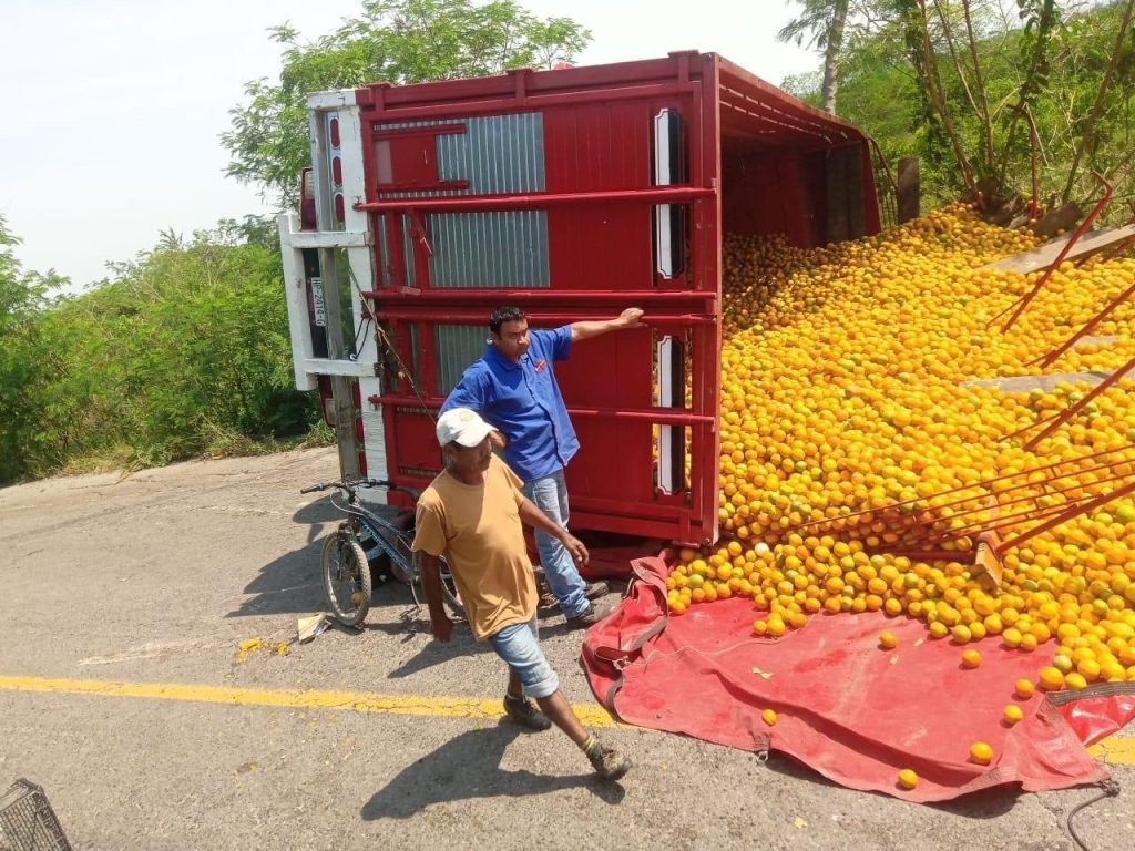 Medios locales informaron que camión que transportaba cítricos volcó sobre su lado derecho, quedando la plancha de carga recostada a mitad de la carretera mientras que la cabina fuera de la cinta asfáltica .