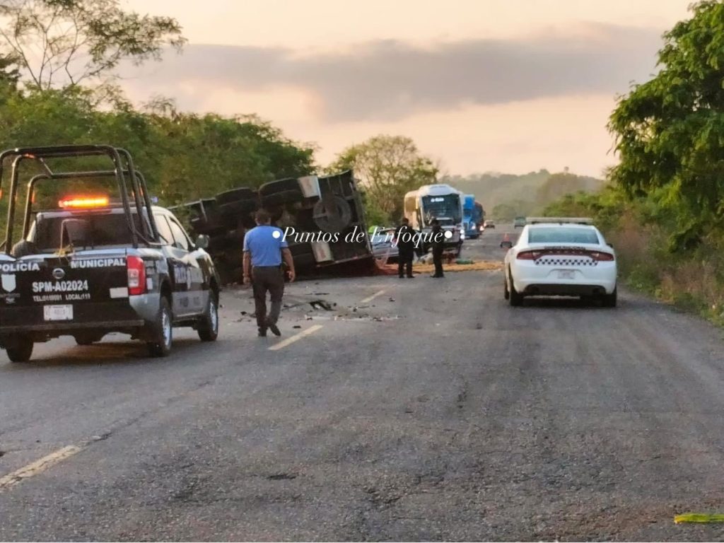 Álamo, Ver. – Un muerto y cuantiosos daños materiales dejó un fuerte accidente en el que se vio involucrado un camión de naranjas t dls vehículos particulares, registrado la mañana de este lunes en la carretera federal 127 Álamo-Tihuatlán.