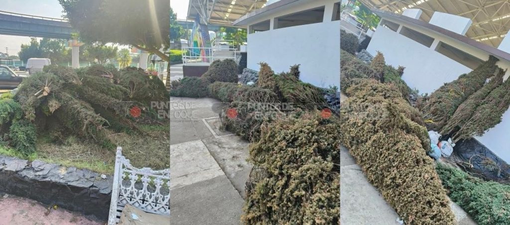 A través de fotografías compartías en redes sociales, se observa a más de una docena de árboles navideños , ya casi secos, cerrados, y amontonados sobre el área verde , así como atrás del escenario del domo de la plaza.